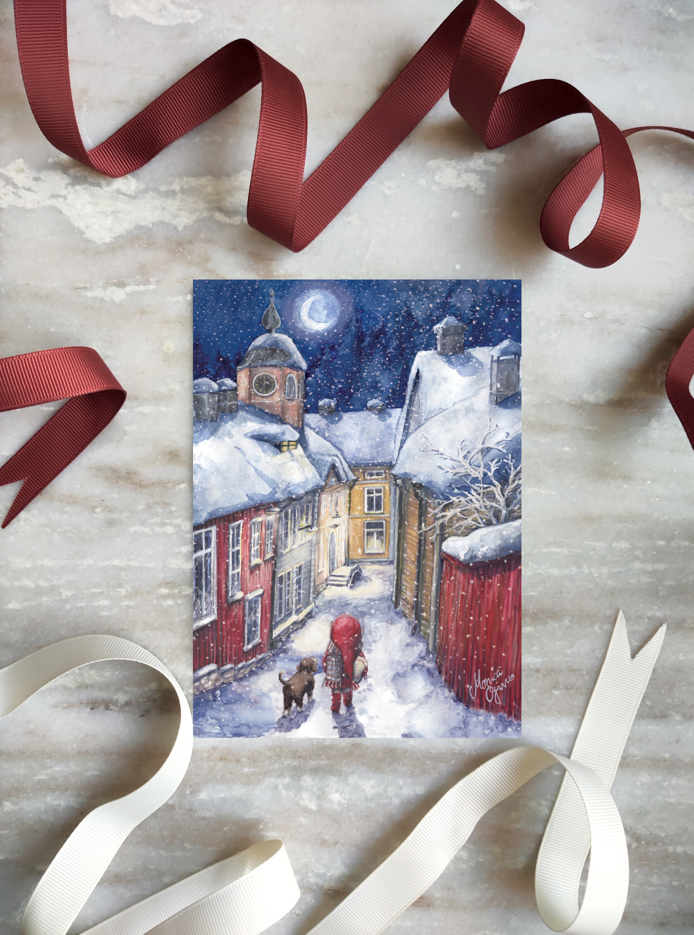 Kuutamossa -joulukortissa tonttu ja koira seikkailevat lumisessa metsässä partiointi tehtävissä. Alkaen 10 kpl 10€ +5,90€ postitus/0€ nouto Porvoosta/ Toimitus perrokalenterin kanssa +7,90€.