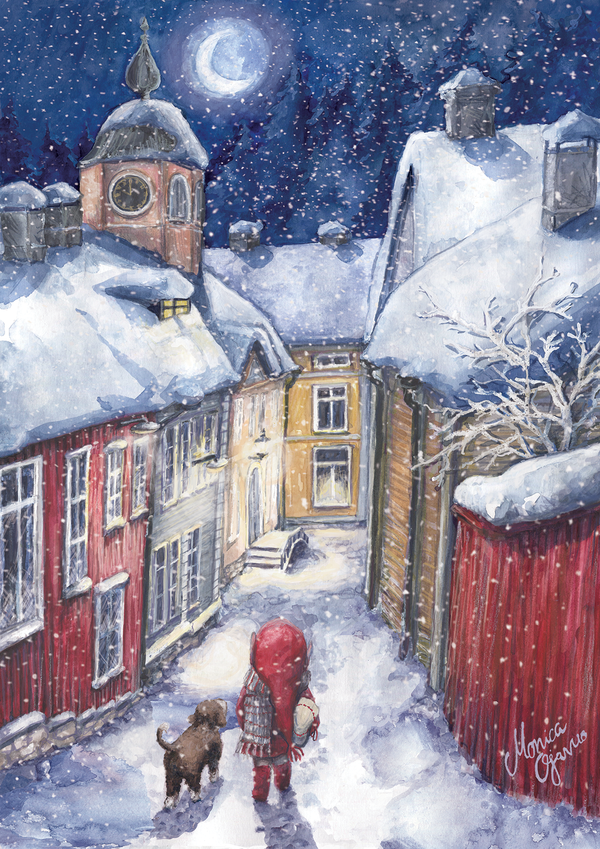 Aattona -kortin kuvitus on siltä siniseltä hetkeltä, kun pukki kiertää aattoiltana talosta taloon. Kortin kuvitus on vuoden 2024 perrokalenterin joulukuun kuvituskuva. Alkaen 10 kpl 10€ +5,90€ postitus/0€ nouto Porvoosta/ Toimitus perrokalenterin kanssa +7,90€.